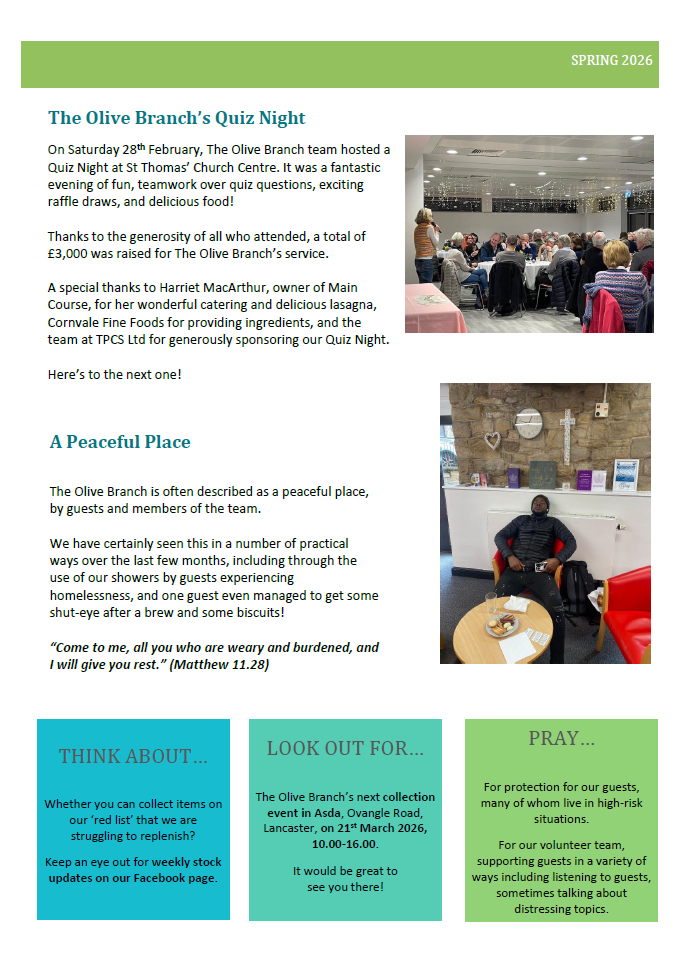 Our spring newsletter is out! Including recent fundraising events, an insight into all that goes on at The Olive Branch and a special letter from a guest.